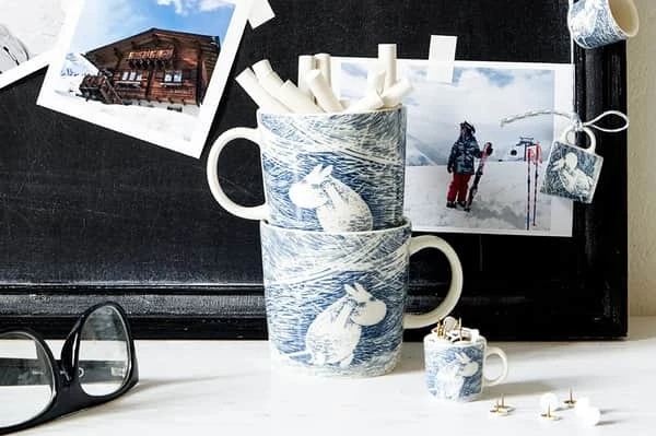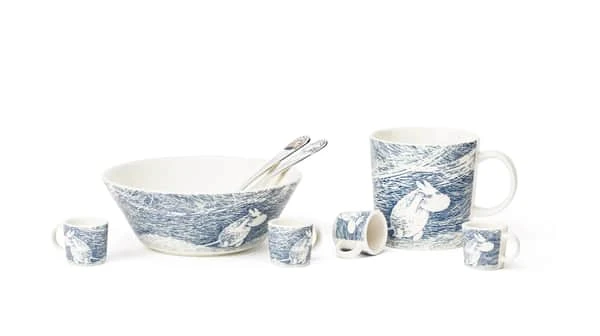 Snestorm-serien fra Arabia er smukt dekoreret med motiver fra Mumitroldenes oplevelser i vinterens stride vejr.