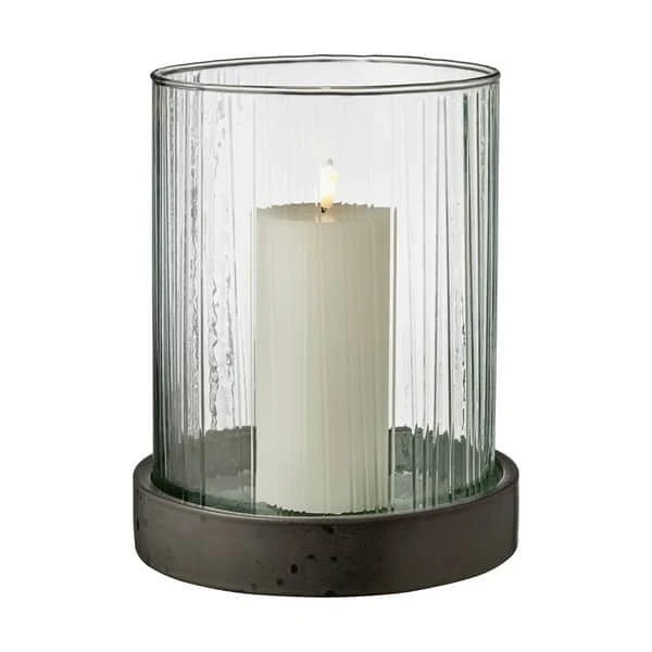 Skab en varm og hyggelig stemning med en hurricane med LED-lys fra BITZ i rustikt glas på en base af stentøj.