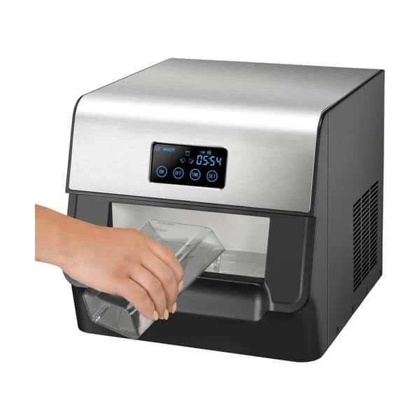Isterningmaskinen har touch-display og timerfunktion. Den har også alarmfunktion og giver lyd, når isterningerne er klar, og når der skal fyldes vand i vandtanken.