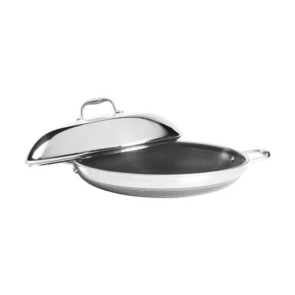 Hexclad er et brand, der har samlet flere gode egenskaber fra forskellige slags pander og gryder, som kokke finder uundværlige – og kalder det for revolutionerende hybridteknologi. Her får du derved de gode varmebestandige egenskaber fra støbejern, den ideelle stegeflade fra stål og non stick-belægningen som gør at maden ikke sætter sig fast, og du kan minimere mængden af fedtstof – smart! Hexclad lover livstidsgaranti (20-30 år).